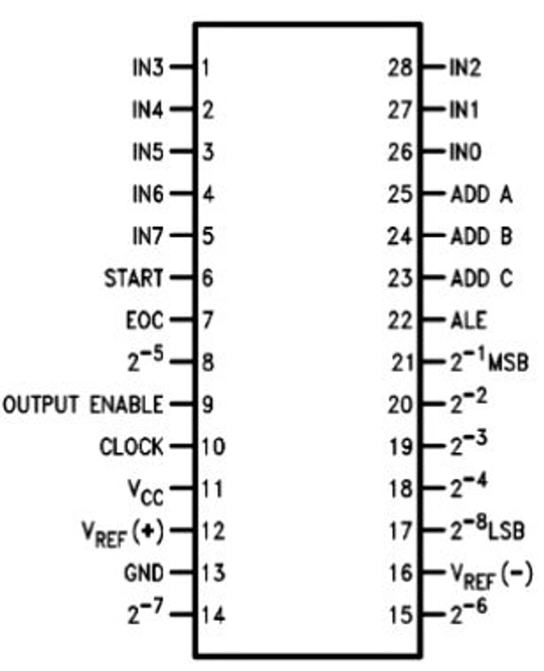 The ADC0809 data acquisition component is based on the monolithic CMOS with an 8-bit analog-to-digital converter, 8-channel multiplexer and microprocessor compatible control logic. These 0809 converters feature a high impedance chopper stabilized comparator, a 256R voltage divider with analog switch tree and a successive approximation register. The 8-channel multiplexer can directly access any of 8-single-ended analog signals.